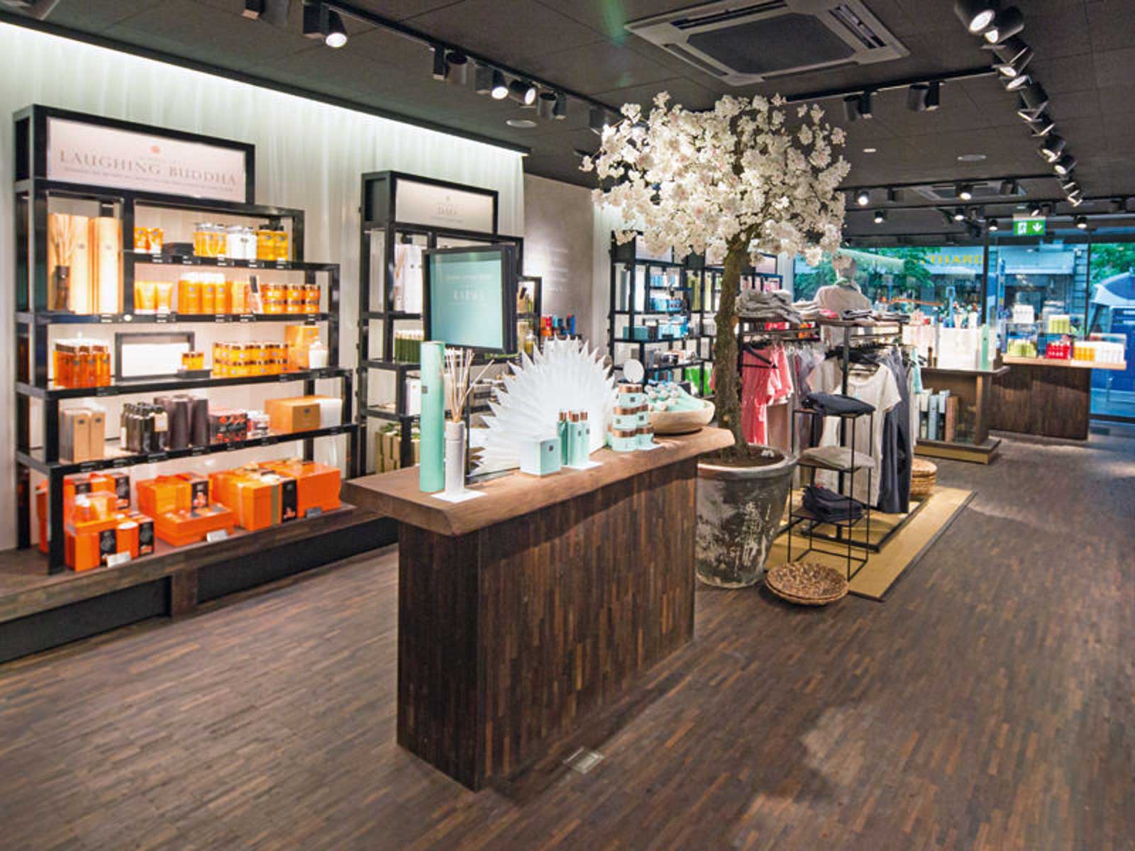 RC: Wir versuchen, gewöhnliche Dinge außergewöhnlich zu machen. Der Besuch in unseren Shops soll etwas Spezielles und ein besonders schönes Erlebnis sein. Deshalb verwenden wir dunkles Holz und echte Bäume – es soll elegant und trotzdem zugänglich sein. Sobald man über die Schwelle tritt, soll man sich entspannen und runterkommen vom Stress auf der Straße. Man bekommt eine Tasse Tee und dazu eine Handmassage und wird richtig verwöhnt, während man sich die Produkte ansieht. Design und Service gehen also Hand in Hand.