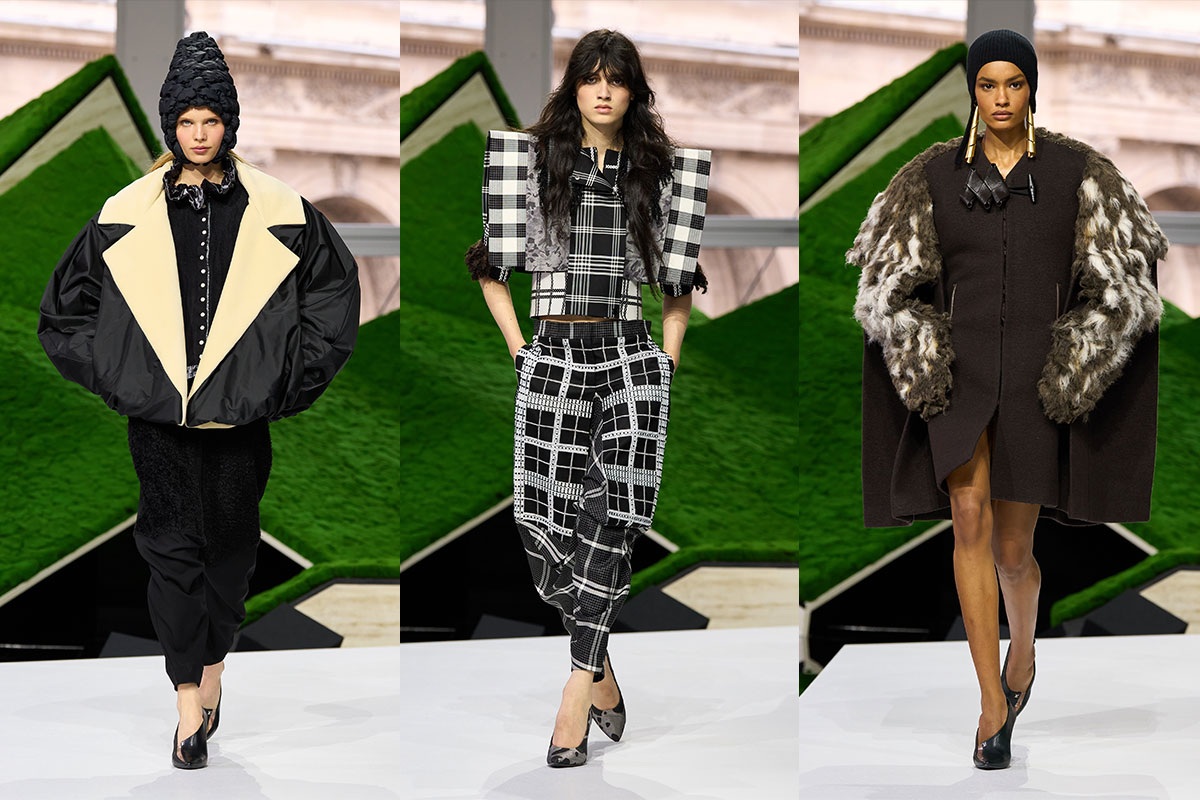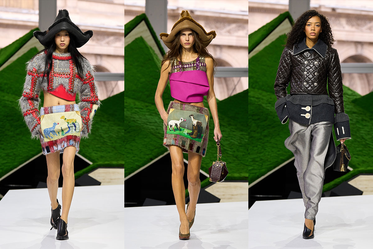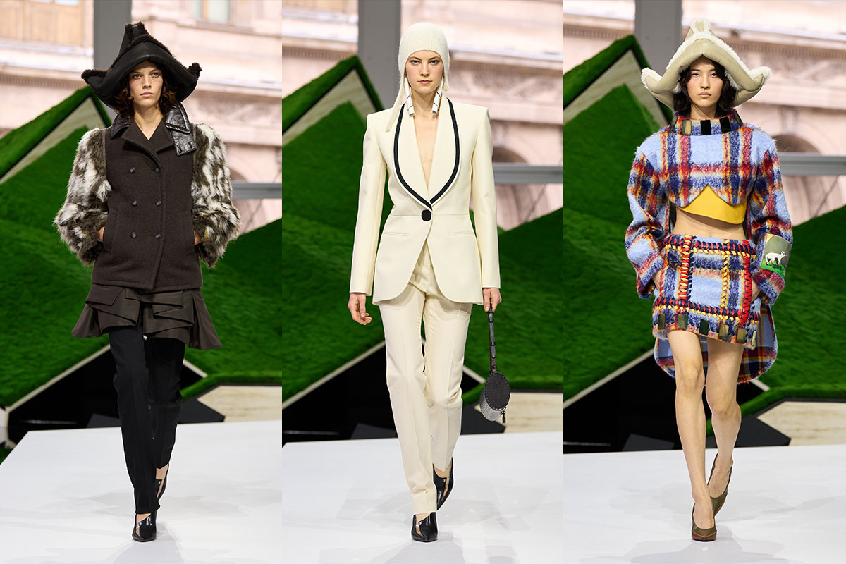 Für die Herbst/Winter 2026/27 Saison lässt sich Nicolas Ghesquière von Landschaften inspirieren – von Bergen, Wäldern und weiten offenen Ebenen. Dieser Einfluss zeigt sich in den starken, schützenden Silhouetten der Kollektion. Schultern werden breiter und Formen dehnen sich nach außen aus, wodurch Formen entstehen, die fest und bewusst wirken.