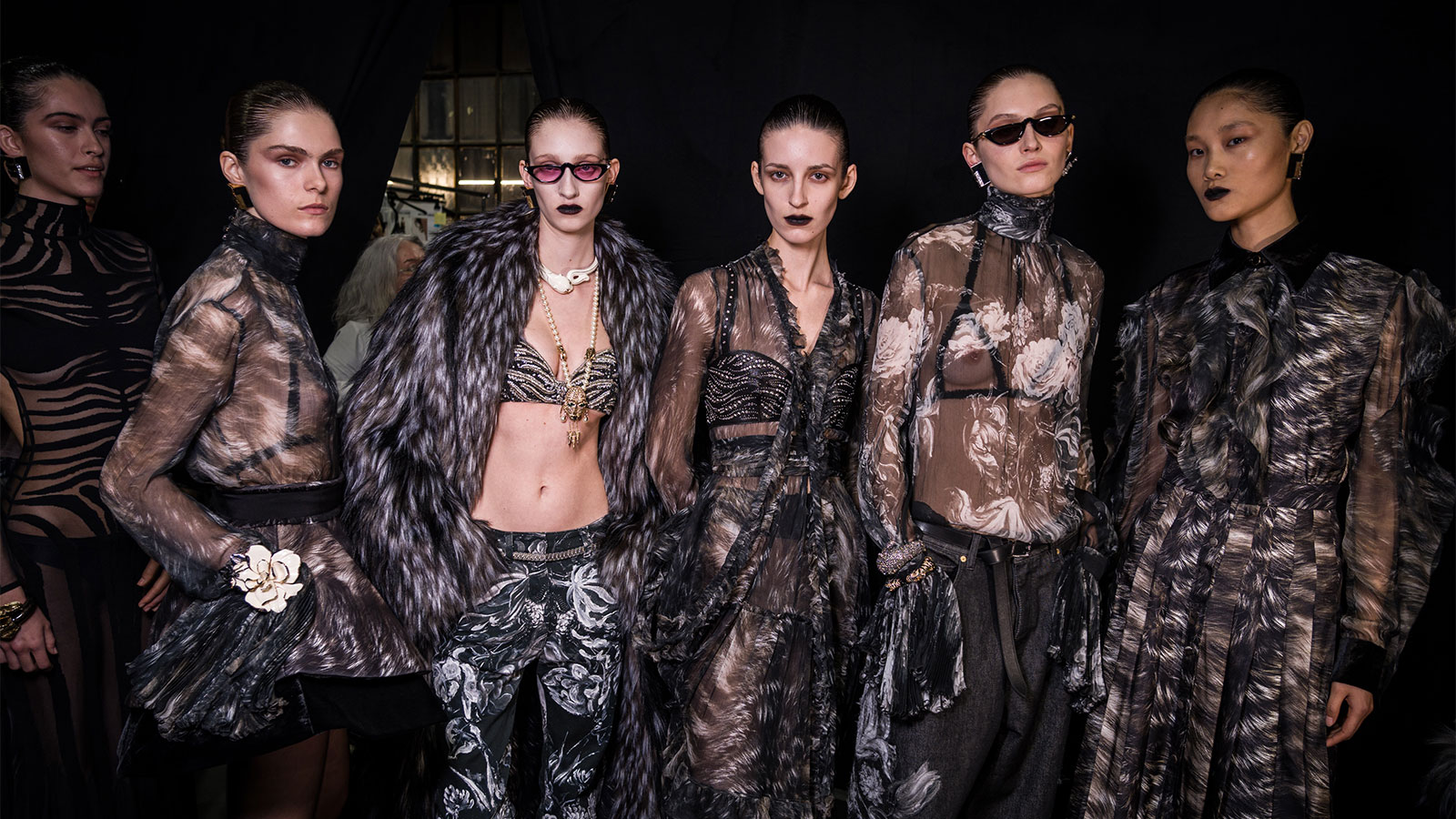 Cavallis Love Language – Animal Print – wechselt den Ton. Zebra ist in transparenten Tüll geschnitten, fast skelettartig, als würde das Muster den Körper kartieren statt ihn zu bedecken. Fotografischer Silberfuchs gleitet über fliessende Silhouetten. Krokodil-geprägtes Leder und Faux Fur bringen Gewicht, gefiederte Säume setzen Bewegung. Animal wird zu Textur, Instinkt, Oberfläche.