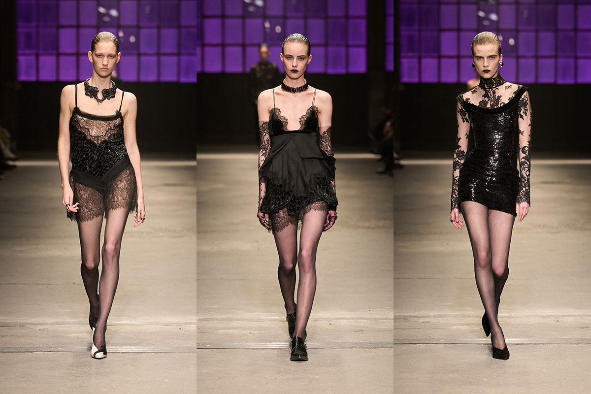 Schwarz dominiert und wird zur Leinwand der Kollektion. Nicht leer, nicht neutral, sondern aufgeladen. Geschichtet in transparenter Spitze, lackiertem Leder, Pailletten und geprägten Jacquards. Samt und matter Chiffon schlucken das Licht; Croc, Glanz und Stickereien brechen es wieder auf. Transparenz trifft auf Dichte, Härte auf Fliessbewegung. Und dann – Spannung. Periwinkle, Cyclamen, elektrisches Pink schneiden durch die Dunkelheit.