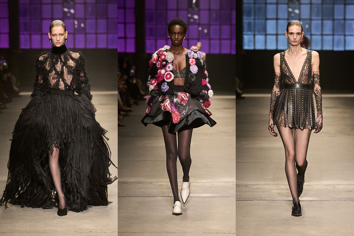 Verführung – ein Cavalli-Pfeiler – bleibt, aber verdichtet. Spitzen-Slips, Pailletten-Minis und transparente Overlays konturieren statt zu überladen. Fausto setzt Brüche: Gladiator-Kleider schneiden klare Linien, ein schwarzes Kleid explodiert in Federvolumen, eine Cropped-Jacke mit floralem Appliké destabilisiert eine skulpturale Mini-Silhouette.