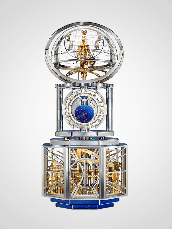 Eine Frage, die man sich niemals stellen sollte, wenn man nicht die Freude im Leben verlieren will: Brauchst du das wirklich? Ruiniert in 99,9 Prozent aller Fälle sofort die Stimmung. Viel besser fragt man: Macht dich das glücklich? „La Quête du Temps“ von Vacheron Constantin, eine über einen Meter hohe Tischuhr, deren Entwicklung sieben Jahre dauerte, braucht nämlich rein rational gesehen eigentlich niemand. Umso dringender wollen wir das Prachtstück haben, denn es ist nicht nur ein Meisterwerk der Uhrmacherei, sondern zelebriert auch Handwerkskunst und Erfindergeist – Werte, die wir keinesfalls verlieren dürfen. Das aufstellbare Kunstwerk, mit integriertem Astronomen, besteht aus 6293 mechanischen Komponenten, 23 uhrmacherischen Komplikationen und drei Ebenen: der Kuppel, der astronomischen Uhr und der Basis. Sieben Patentanmeldungen im Bereich Uhrmacherei und acht Patentanmeldungen im Bereich Automaten resultieren aus dieser Haute- Horlogerie-Extravaganza.