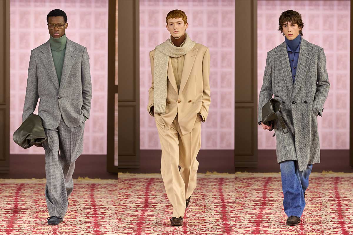 Bei Zegna geht es im Herbst/Winter 2026 darum, Kontinuität als eine Art Widerstand zu zeigen. Die Kollektion wird in einem imaginären Familienkleiderschrank präsentiert, der aus echten Kleidungsstücken der Zegna-Verwandtschaft zusammengestellt wurde, und zeigt Herrenmode als etwas, das man sammelt und nicht einfach so verbraucht. Unter Alessandro Sartori wird die Schneiderei lockerer, ohne aber ihre Autorität aufzugeben: Mäntel werden länger, Schultern eckiger, Hosen werden höher und haben ein ausgewogenes Volumen. Klassische Codes sind nicht verworfen, sondern neu kalibriert, mit Zweireiherjacken, die so gestaltet sind, dass sie Funktion und Proportionen verändern.