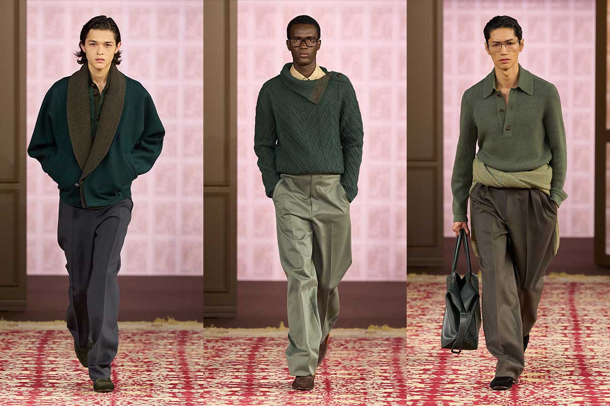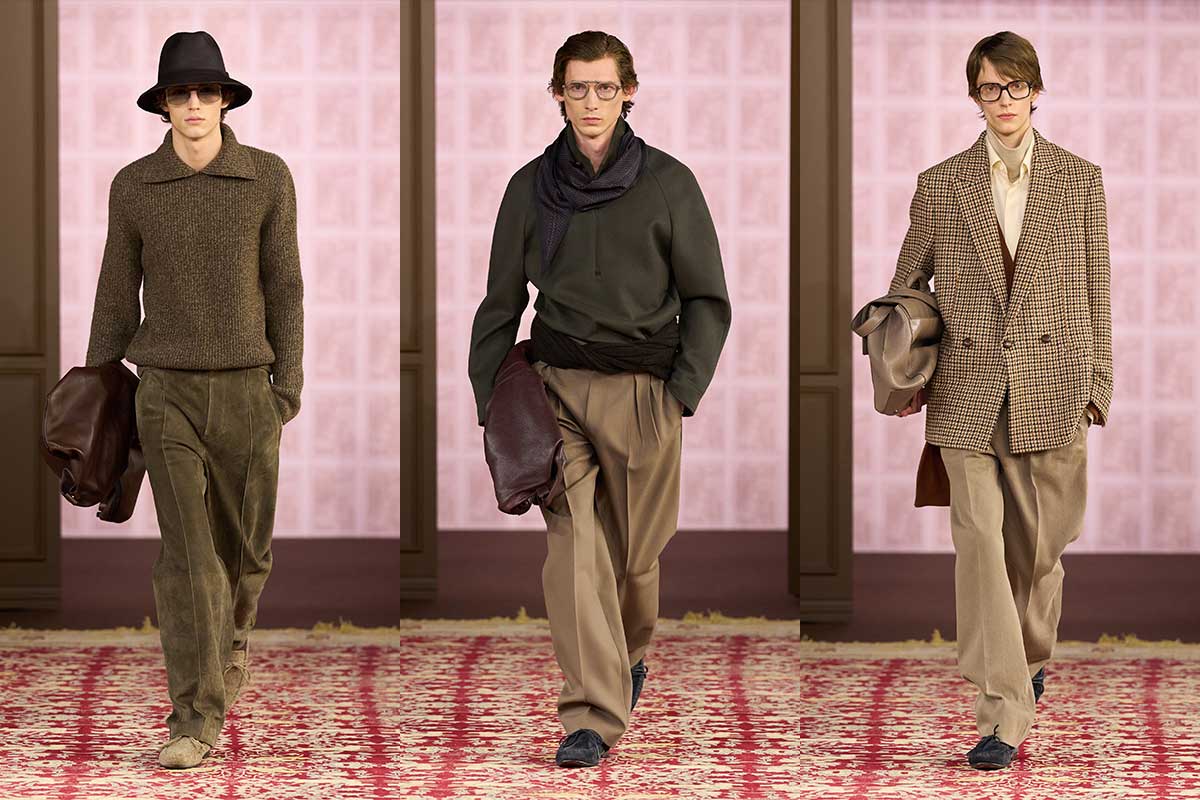 Nicht die Silhouette, sondern der Stoff bestimmt die Erzählung. Trofeo-Wolle, Kaschmir, Flanell und Tweed werden eher als Mittel zur Langlebigkeit denn als Verzierung eingesetzt, während eine zurückhaltende, erdige Farbpalette saisonale Effekthascherei ablehnt. In einer Branche, die von ständiger Innovation abhängig ist, vertritt Zegna eine zurückhaltendere These: Relevanz liegt heute in Kleidung, die auf Langlebigkeit, Anpassungsfähigkeit und Wiederverwendbarkeit ausgelegt ist.
